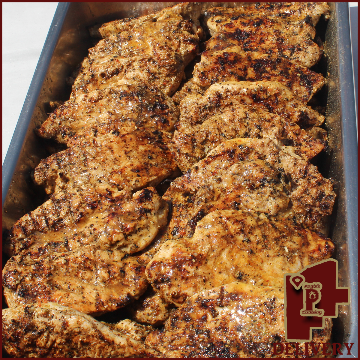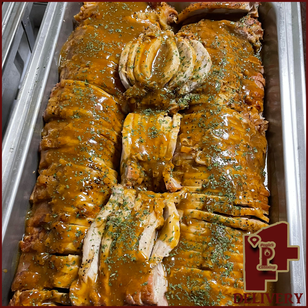 We offer free delivery to select areas on all orders of 50 plates or more with free buffet style service included! Our dishes have been selected to hold up for delivery to our whole free delivery area. That means we’ve chosen items that when prepared and packaged won’t break down over time. No more mushy pasta, no more over cooked vegetables. Pogie’s food is delivered and served as fresh as it would be out of the oven.